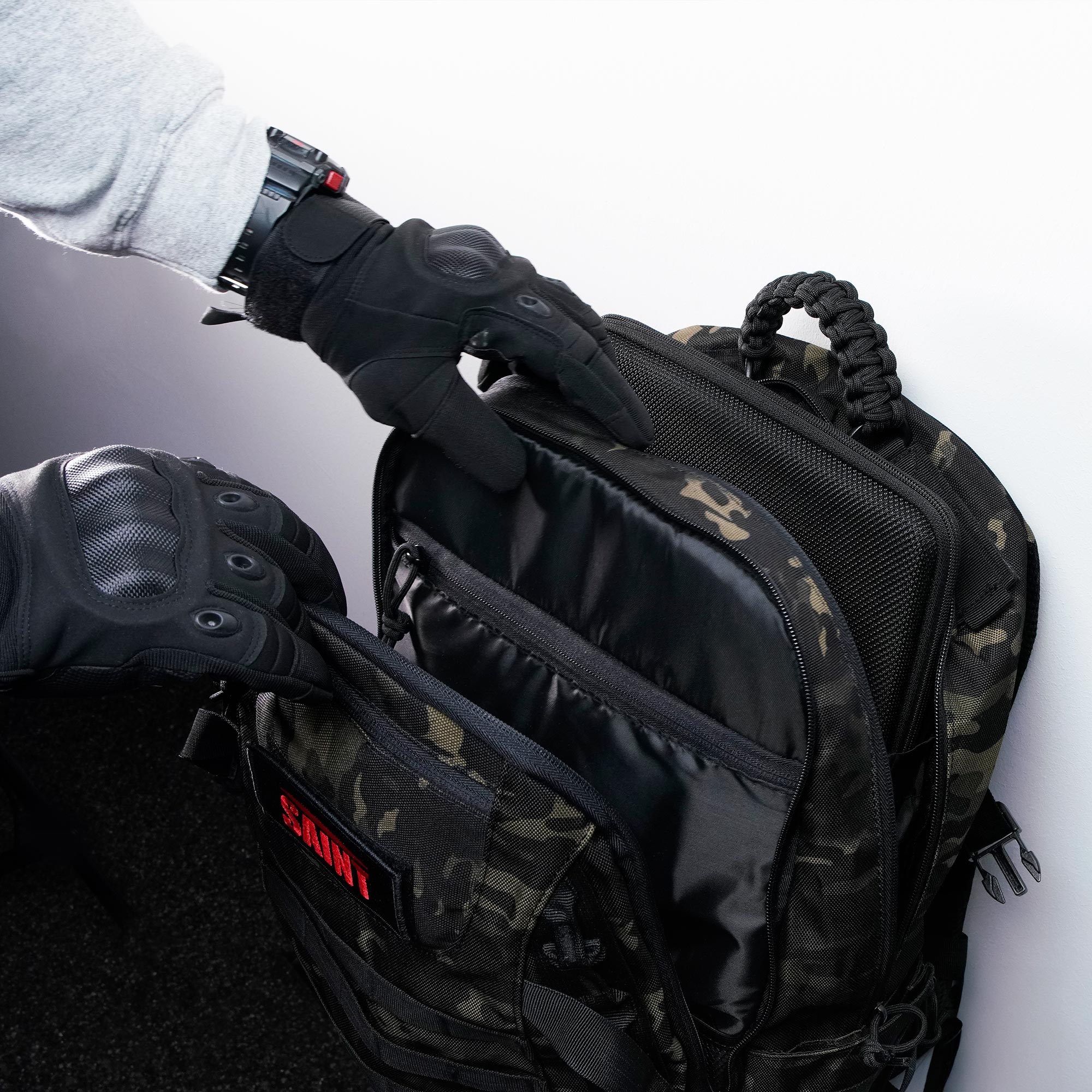 Sein Design umfasst ein MOLLE-System auf der Vorderseite und an den Seiten, das eine modulare Erweiterung mit Taschen oder Ausrüstungsgegenständen ermöglicht. Ein verstärkter Tragegriff an der Oberseite sorgt für sicheren Halt beim Befüllen und Abnehmen des Rucksacks. Seitliche Flaschenhalter sorgen dafür, dass Sie Ihre Trinkflaschen immer in Reichweite haben, während ein mit Klettverschluss versehener Bereich mit einem individuellen SAINT-Logoaufnäher versehen ist – Identität und Zugehörigkeit sind in die Ausrüstung eingenäht.