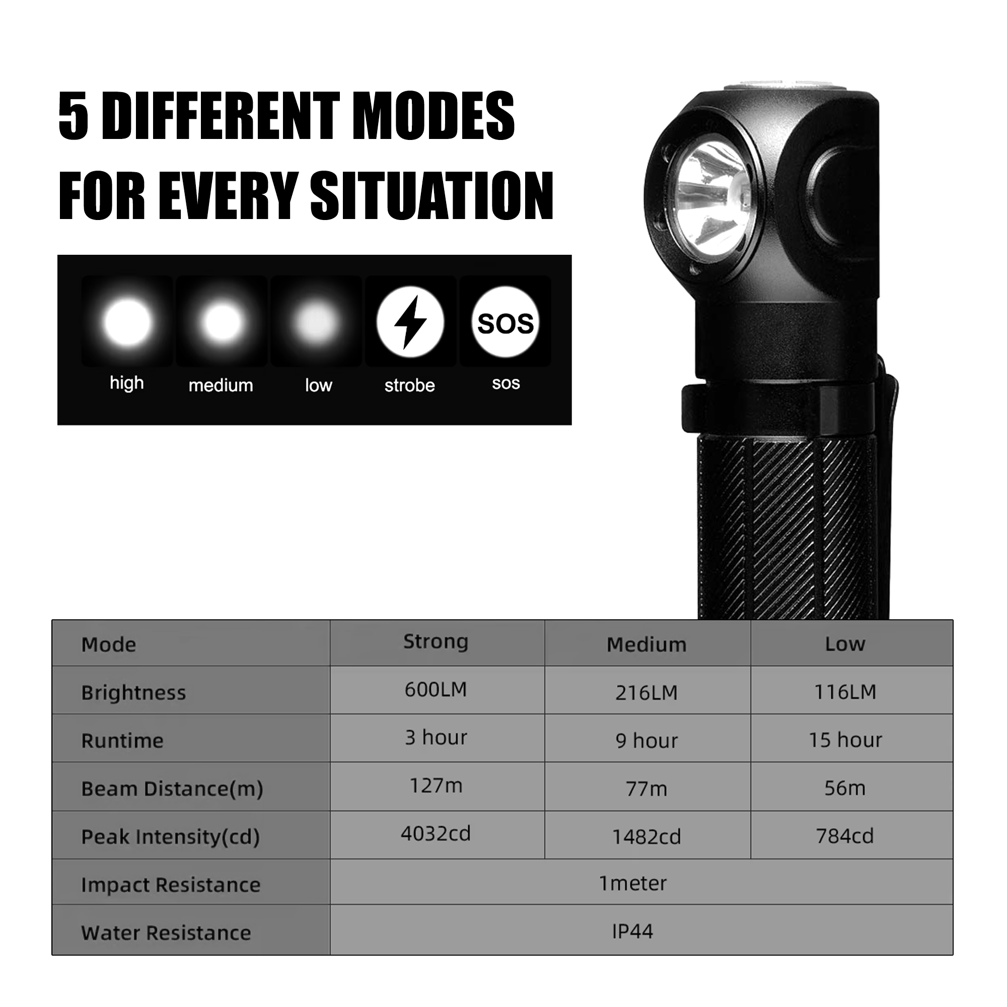 The TORCH delivers illumination with purpose — up to 127 meters of reach powered by a compact 600-lumen output. Built from durable aluminum alloy and rated IP44 waterproof, it resists rain, dust, and impact while keeping weight down to just 114 g.
